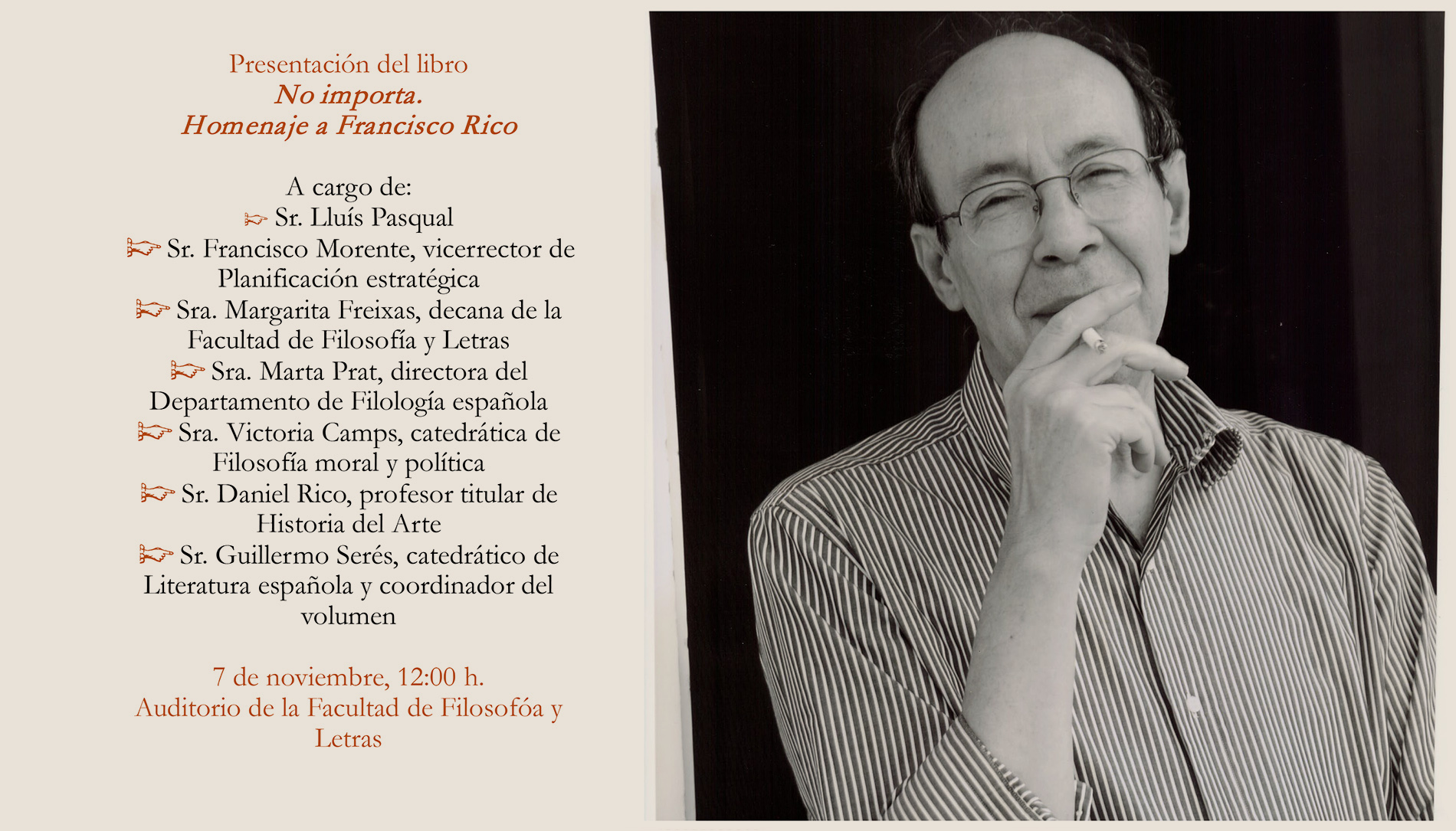 Homenaje a Francisco Rico Oct 15, 2025 | Departamento, Noticias Homenaje a Francisco Rico Viernes, 7 de noviembre, 12h. Auditorio de la Facultad de Filosofía y Letras Programa